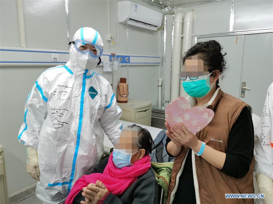 Photo taken with a mobile phone shows a 98-year-old woman patient (in a wheelchair) and her daughter (3rd R) taking a group photo with medical workers before leaving the Leishenshan hospital in Wuhan, central China's Hubei Province, March 1, 2020. A 98-year-old woman patient of the novel coronavirus disease (COVID-19), so far the oldest critical patient cured in China, has been discharged from a makeshift hospital in Wuhan, capital of central China's Hubei Province, Sunday after recovery.(Photo by Gao Xiang/Xinhua)