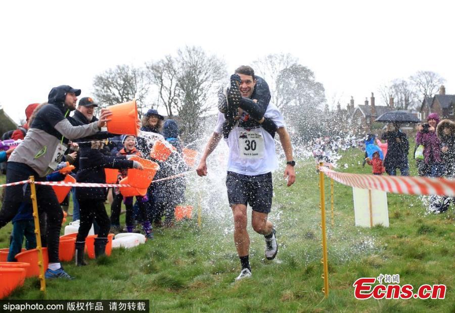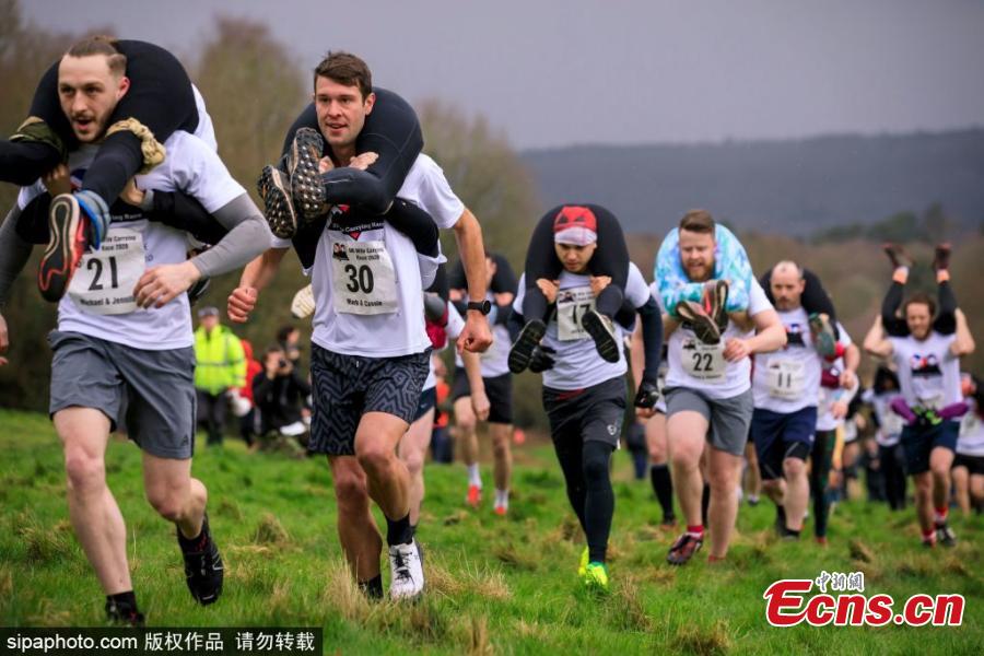 The bizarre wife-carrying contest kicks off along a 380-metre course in Dorking, Surrey, UK, Mar. 1, 2020. Rules state that those being carried can in fact be male or female but must weigh at least 50 kilograms. First place finishers will compete at the World Wife Carrying Championships in Finland in July. (Photo/ Sipaphoto)