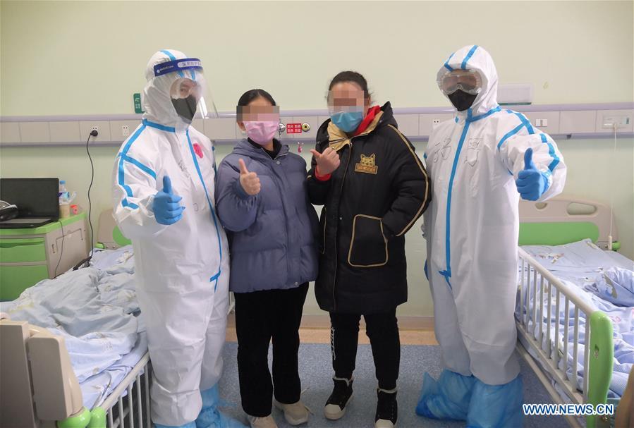 Photo taken with a mobile phone shows nurses and children infected with novel coronavirus pneumonia cheering themselves up at a ward in Wuhan Children's Hospital in Wuhan, central China's Hubei Province, Feb. 26, 2020. Because of the high infectivity of the novel coronavirus, some child patients infected with the virus have to live in the hospital to receive the medical treatment without the company of their parents and families. In the epidemic-hit city of Wuhan, there are 15 such child patients receiving the treatment in the Wuhan Children's Hospital, a designated one to treat children infected with novel coronavirus pneumonia. These children, aging from 6 to 14, have been taken good care by seven nurses -- three female and four male. Most of these nurses have their own kids so they have rich experience in taking care of children. As the children's "temporary parents," the seven not only look to the kids' daily lives but also help them with schoolwork. Every day, they lead the children to do physical exercises, urge the older ones to do homework, and teach the younger ones to learn new words and Chinese phrases. (Xinhua)