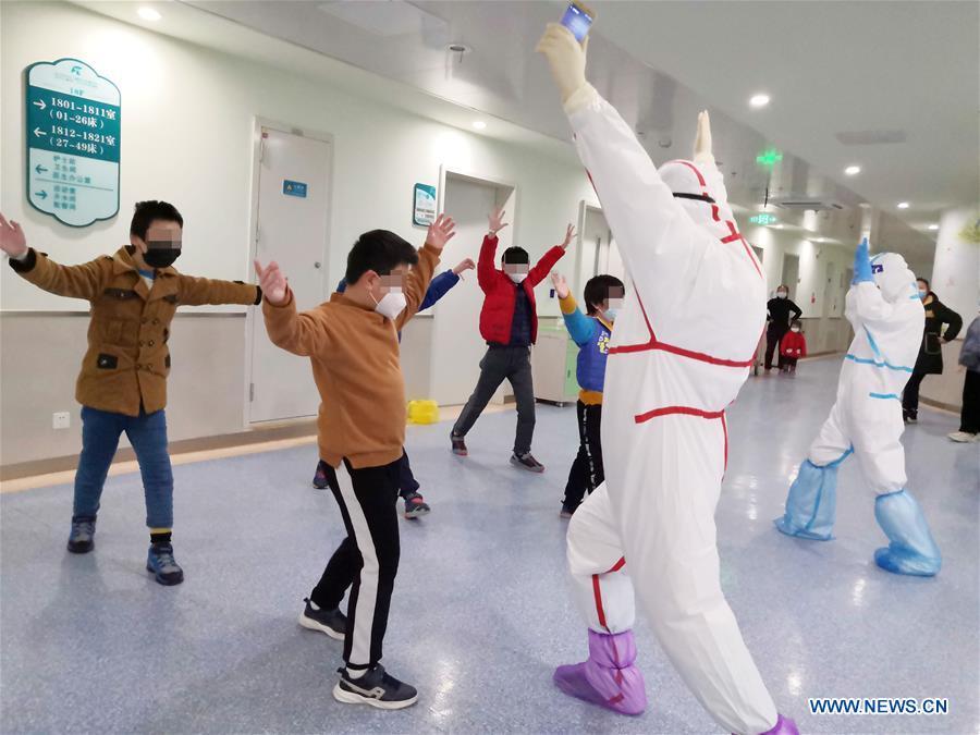 Photo taken with a mobile phone shows two male nurses leading children infected with novel coronavirus pneumonia to do physical exercises at a ward in Wuhan Children's Hospital in Wuhan, central China's Hubei Province, Feb. 27, 2020. Because of the high infectivity of the novel coronavirus, some child patients infected with the virus have to live in the hospital to receive the medical treatment without the company of their parents and families. In the epidemic-hit city of Wuhan, there are 15 such child patients receiving the treatment in the Wuhan Children's Hospital, a designated one to treat children infected with novel coronavirus pneumonia. These children, aging from 6 to 14, have been taken good care by seven nurses -- three female and four male. Most of these nurses have their own kids so they have rich experience in taking care of children. As the children's "temporary parents," the seven not only look to the kids' daily lives but also help them with schoolwork. Every day, they lead the children to do physical exercises, urge the older ones to do homework, and teach the younger ones to learn new words and Chinese phrases. (Xinhua)