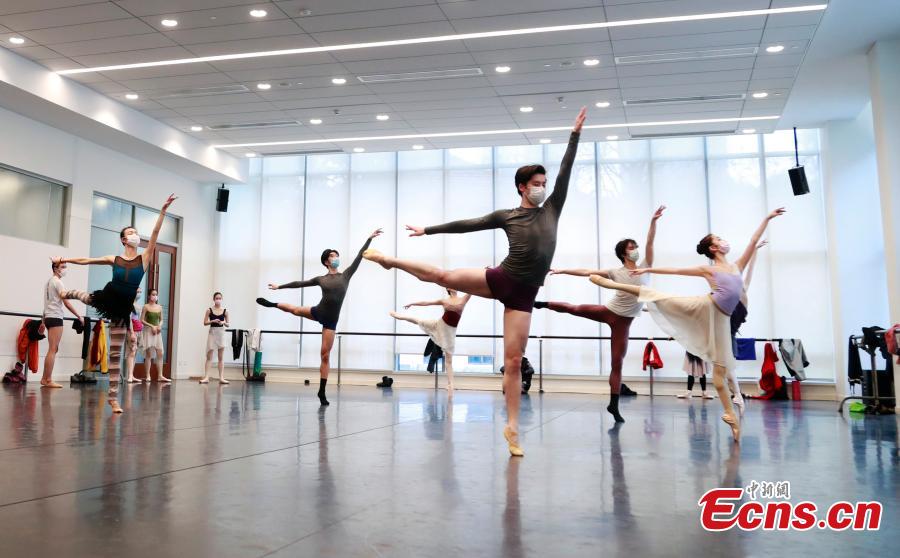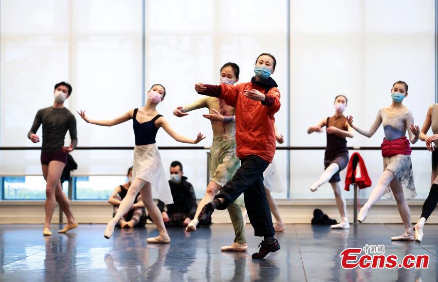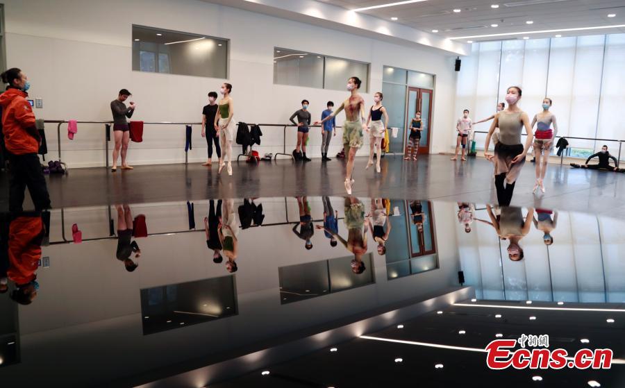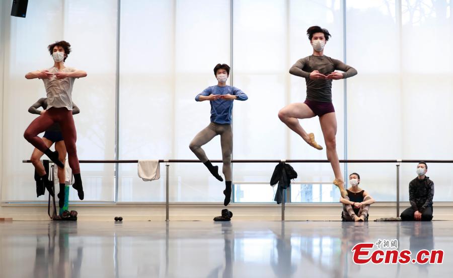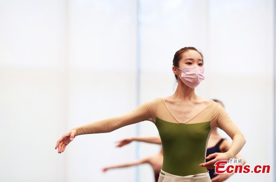 In preparation for scheduled tour in June this year, Shanghai Ballet dancers wearing masks practice in a dance studio in Shanghai amid the coronavirus outbreak, Mar. 2, 2020. (Photo: China News Service/Tang Yanjun)