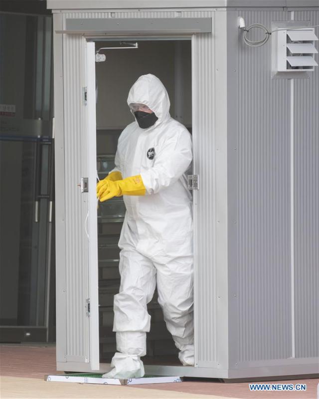 Medical workers prepare to receive suspected patients at a medical center in Daegu, South Korea, March 3, 2020. South Korea confirmed 851 more cases of the COVID-19 on Tuesday, raising the total number of infections to 5,186. (Photo by Lee Sang-ho/Xinhua)