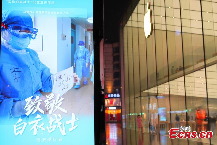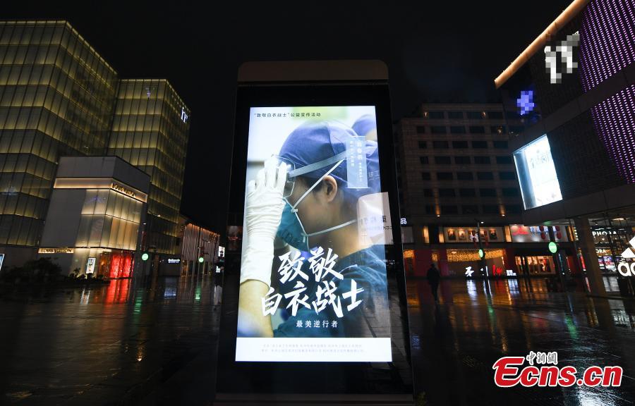 A photo of a medical worker is seen on an outdoor LED screen in Hangzhou, East China’s Zhejiang province, Mar. 3, 2020. Starting from Monday this week, photos of medical workers, and slogans to support their efforts are screened on glass curtain walls of landmarks of the city, as a effort to pay tribute to those who fight the coronavirus on the front line. (Photo: China News Service/ Wang Gang)