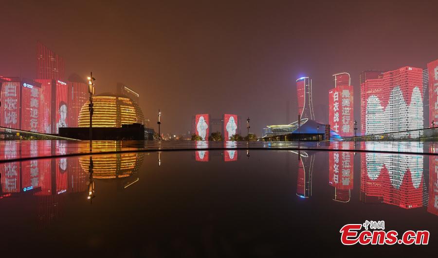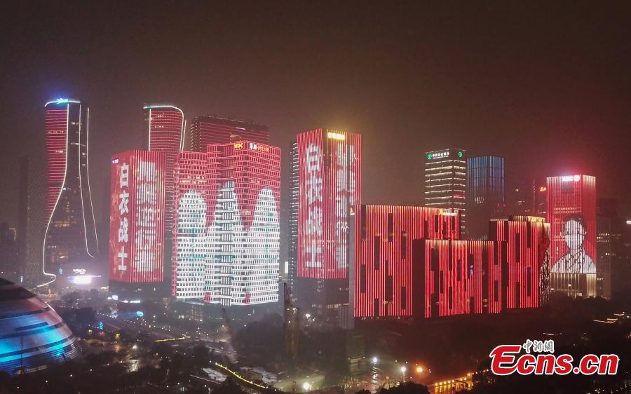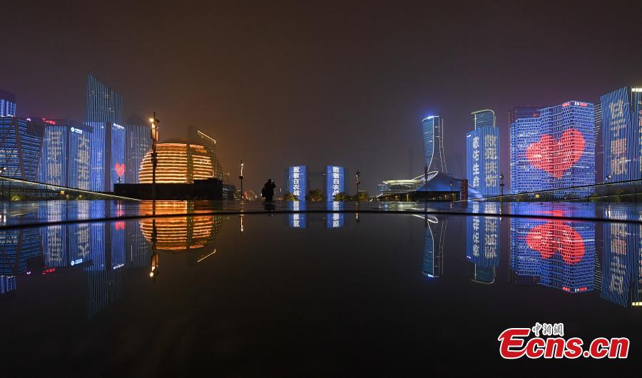 Slogans to support medical workers in the coronavirus fight are seen on landmark buldings along the Qiantang River in Hangzhou, East China’s Zhejiang province, Mar. 3, 2020. Starting from Monday this week, photos of medical workers, and slogans to support their efforts are screened on glass curtain walls of landmarks of the city, as a effort to pay tribute to those who fight the coronavirus on the front line. (Photo: China News Service/ Wang Gang)