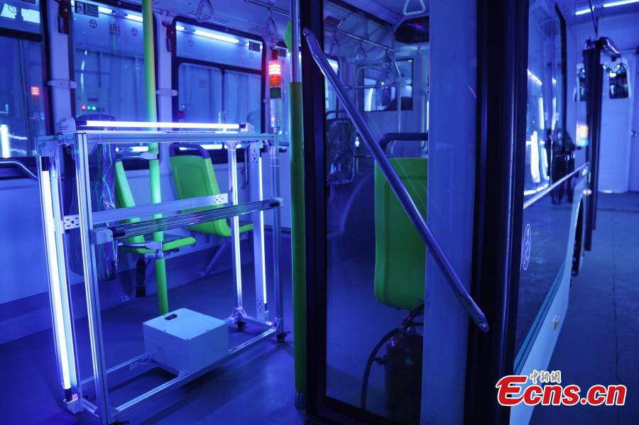A bus is being disinfected by ultraviolet light in Shanghai, Mar. 4, 2020. According to the latest guideline on the diagnosis and treatment of the novel coronavirus released by the National Health Commission, the virus is sensitive to ultraviolet light and heat, so ultraviolet radiation can effectively eliminate the virus. (Photo: China News Service/Zhang Hengwei)