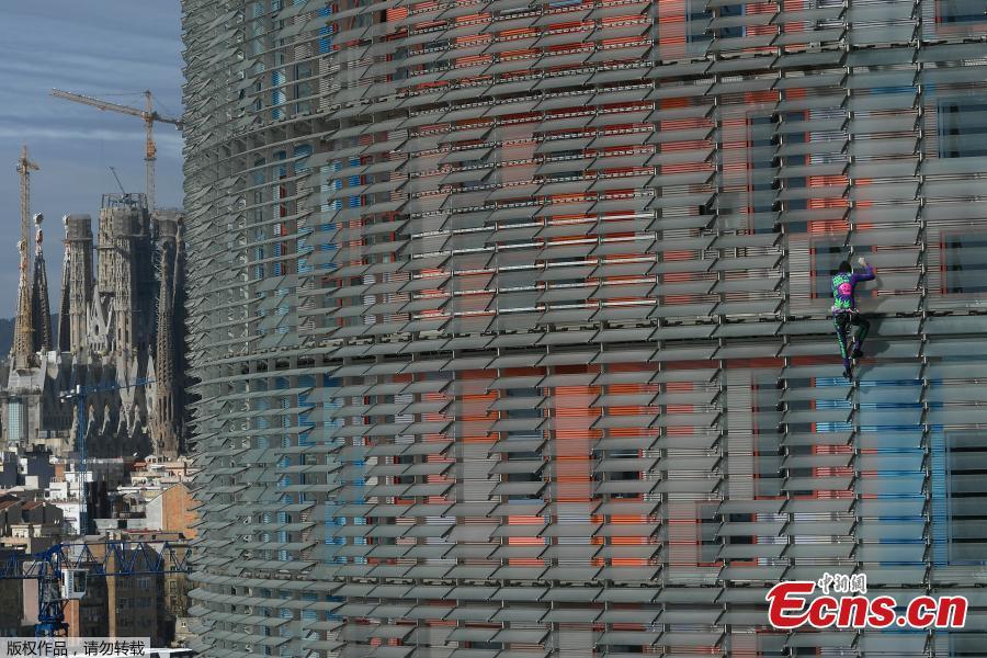 French skyscraper climber Alain Robert, known as the French Spiderman, climbs the Agbar Tower in Barcelona on March 4, 2020 as a symbolic action to call on governments and individuals across the world to be more responsible in the face of the COVID-19 coronavirus outbreak. (Photo/Agencies)
