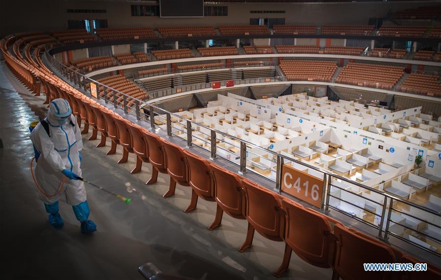 Staff members clean up a makeshift hospital in Wuhan, central China's Hubei Province, March 8, 2020. The makeshift hospital converted from a sports venue was officially closed on Sunday after its last batch of cured COVID-19 patients were discharged. A full disinfection to the hospital will follow. (Xinhua/Xiao Yijiu)