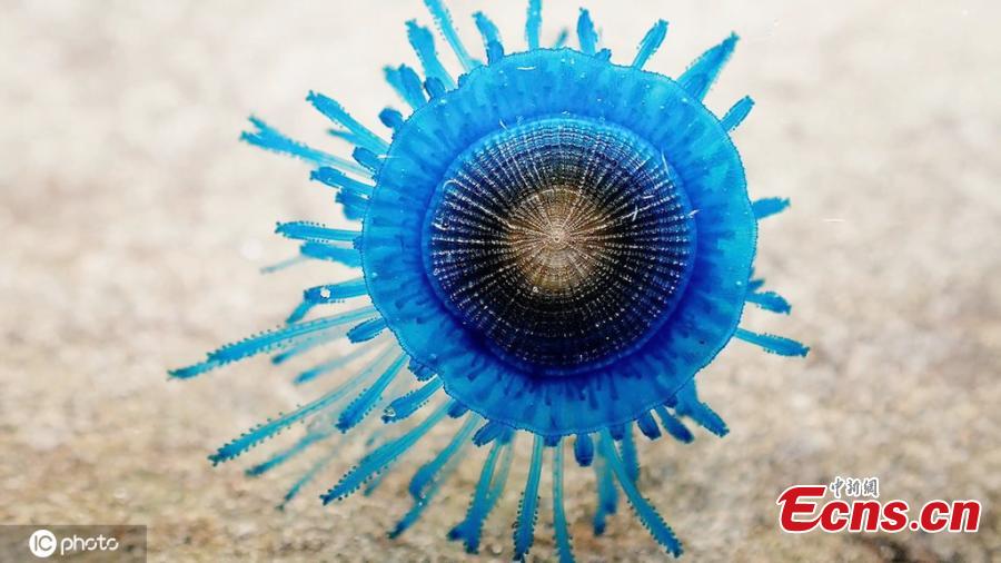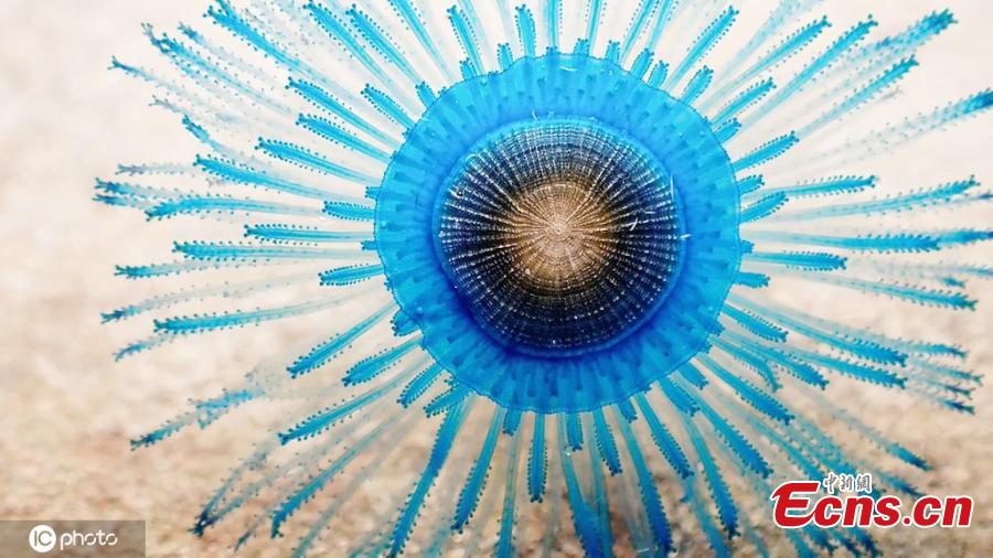 This small but stunning sea creature has been spotted and captured in a high definition clips. Marine biologist Lawrence Scheele stumbled across the critter in a rock pool at Rainbow Beach, Queensland, Australia. Known as porpita porpita, the seemingly lifeless organism was floating in the small pool. What is more interesting is its float sporting an electrifying blue color, and the tentacle-like limbs known as the hydroid colony, containing the stinging cells. (Photo/IC)