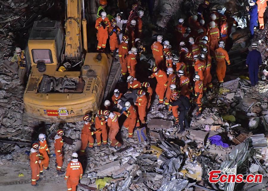 Firefighters try to rescue a woman and her son from the rubble of a collapsed hotel in Quanzhou, East China's Fujian province, March 9, 2020. A mother and her son were pulled from the rubble by firefighters at around 23:08 Monday after a hotel building collapsed in east China's Fujian Province nearly 52 hours prior to that. (Photo: China News Service/ Zhang Bin)