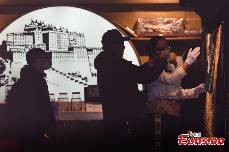 An interpreter shows cultural relics during a 5G live broadcast at the Potala Palace in Lhasa, capital city of the Tibet autonomous region, Mar. 9, 2020. (Photo: China News Service/He Penglei)