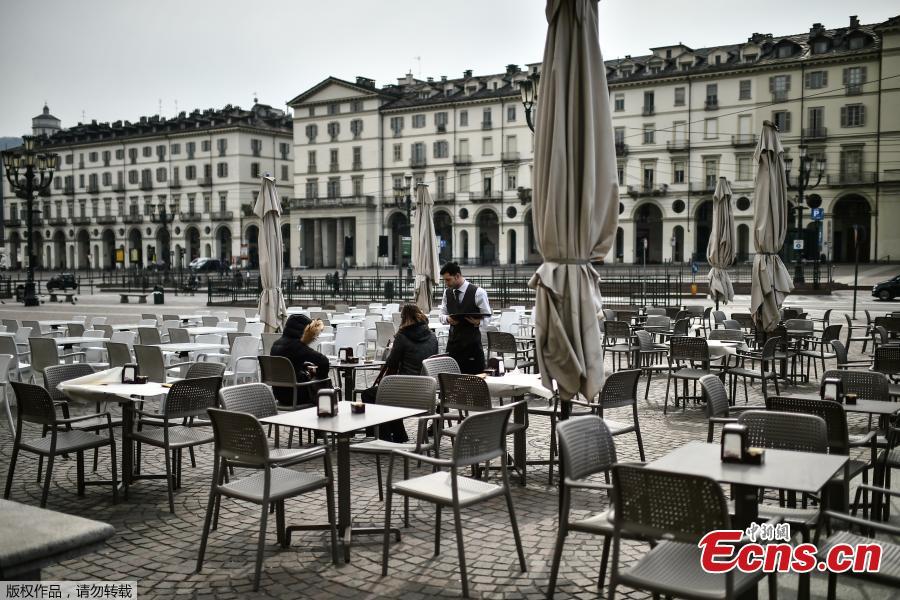 Customers order drinks at a deserted cafe terrace on March 9, 2020 on Piazza Vittorio in Turin, as Italy has imposed a virtual lockdown on the north of the country in the battle against the coronavirus outbreak. (Photo/Agencies)