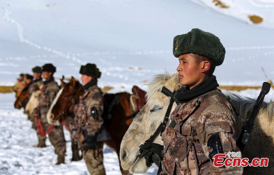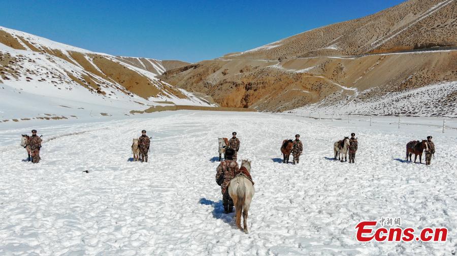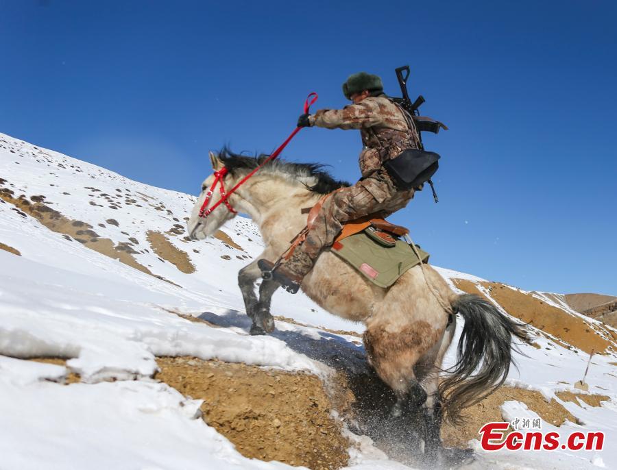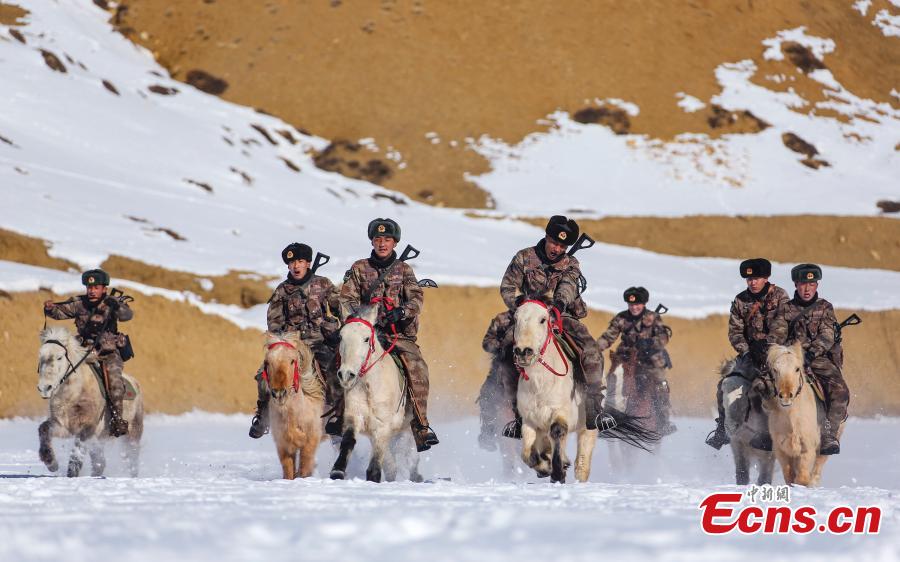 Riding on horses, soldiers based in Ali prefecture, Southwest China's Tibet autonomous region train on March 10, 2020. The training session was carried out in region with an average elevation of 4,600 meters above sea level when the temperature was as low as minus 25 degrees Celsius. (Photo: China News Service/Liu Xiaodong)