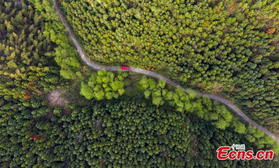 The aerial photo shows a truck driving on road in forest in Xiannvhu district in Xinyu city, East China's Jiangxi province, Mar. 11, 2020. (Photo: China News Service/Zhao Chunliang)