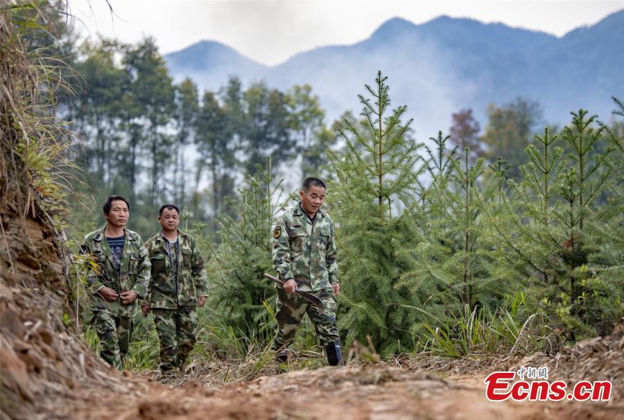 Forest ranger Cao Hongzhong and his son Cao Xiaohua patrol on a mountain in Xinyu city, East China's Jiangxi province, Mar. 11, 2020. (Photo: China News Service/Zhao Chunliang)