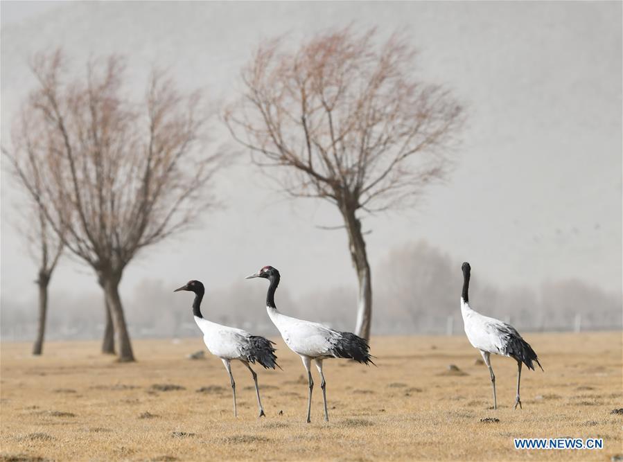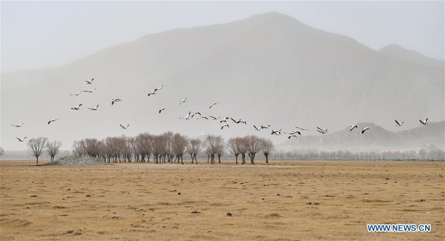 Photo taken on March 11, 2020 shows black-necked cranes on the northern bank of Yarlung Zangbo River in Shannan City, southwest China's Tibet Autonomous Region. (Xinhua/Jigme Dorje)