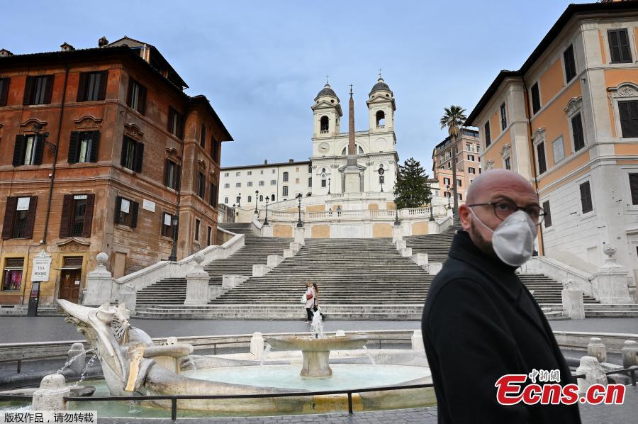 A man wearing a protection mask walks by the Spanish Steps at a deserted Piazza di Spagna in central Rome on March 12, 2020, as Italy shut all stores except for pharmacies and food shops in a bid to halt the spread of a coronavirus. (Photo/Agencies)