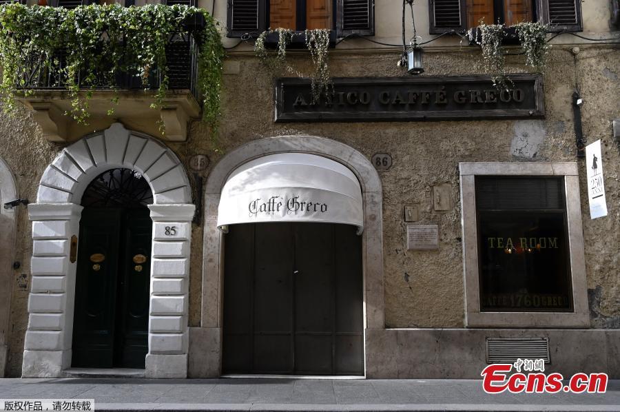 A closed Caffe Greco is pictured in central Rome on March 12, 2020, as Italy shut all stores except for pharmacies and food shops in a bid to halt the spread of a coronavirus. (Photo/Agencies)