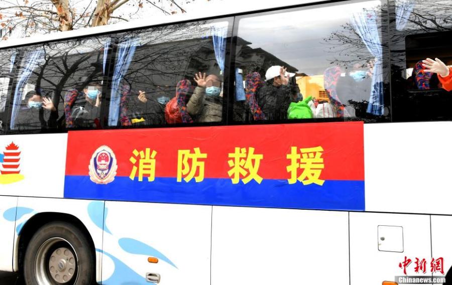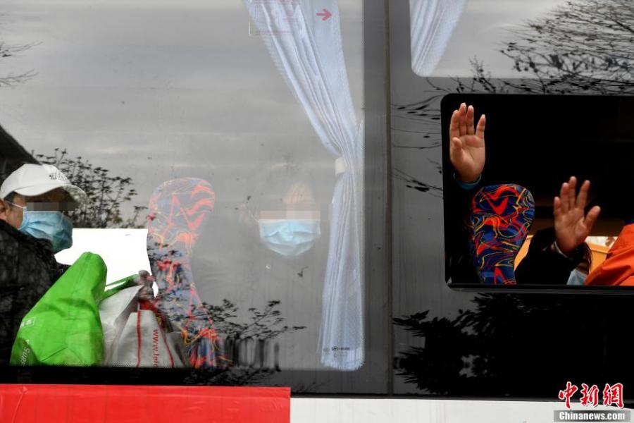 Cured coronavirus patients wave goodbye to medical workers after a 14-day quarantine for medical observation at a rehabilitation center in Wuhan, central China's Hubei Province, March 12, 2020.(Photo: China News Service/An Yuan)