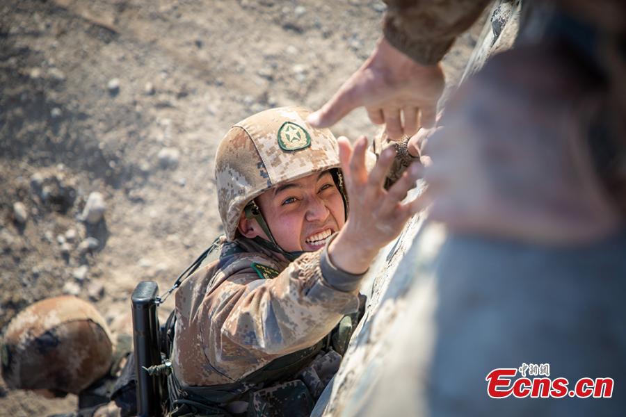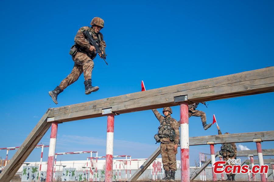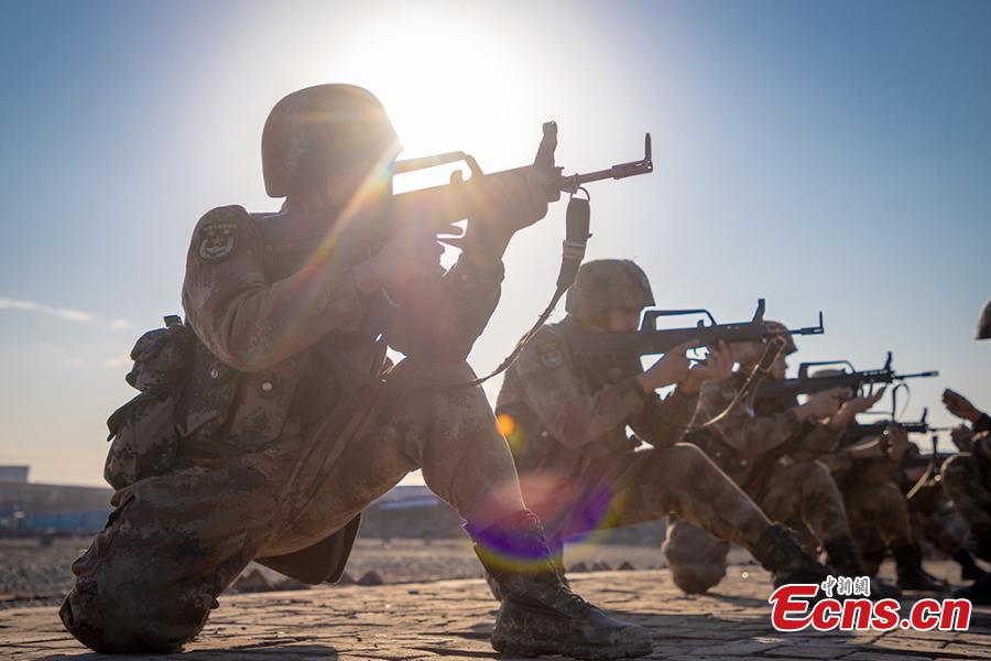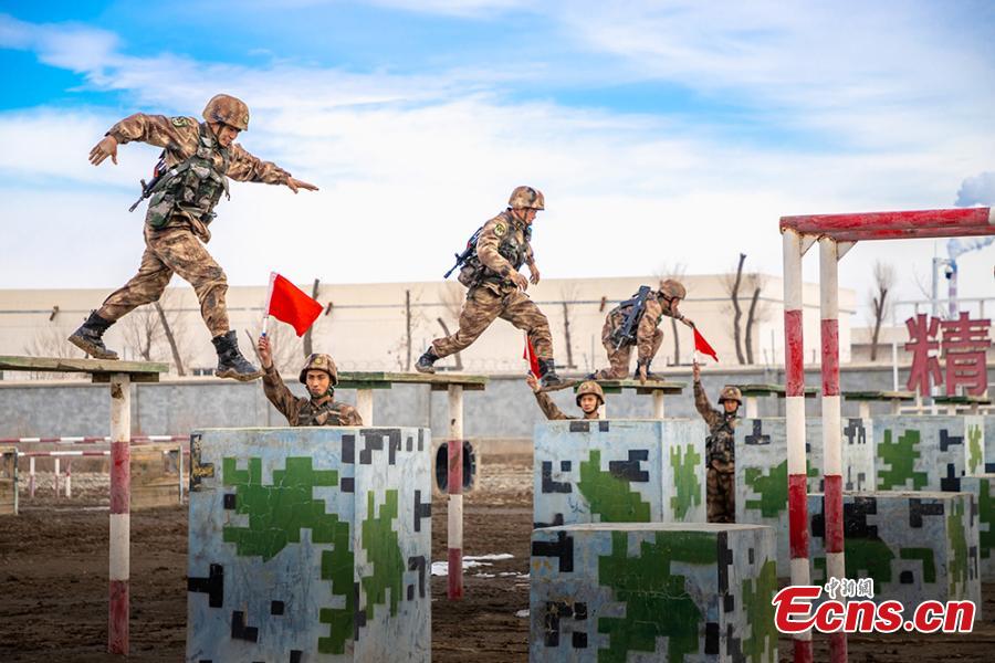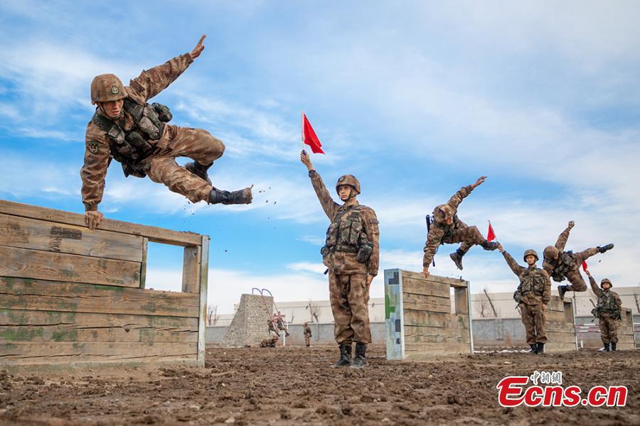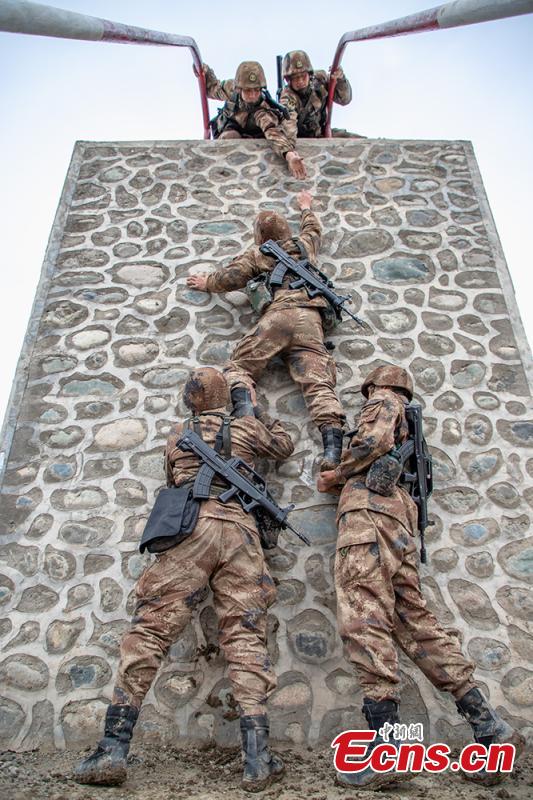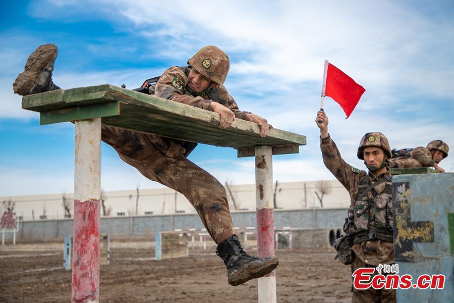 Soldiers of Xinjiang military region take part in a training in Northwest China's Xinjiang Uygur autonomous region in March, 2020. The exercises includes shooting practice, physical training and obstacle crossing drilling. (Photo: China News Service/Zhou Kaiwei)