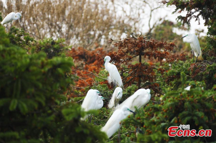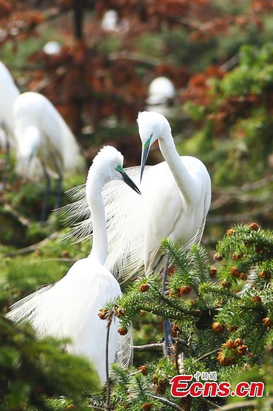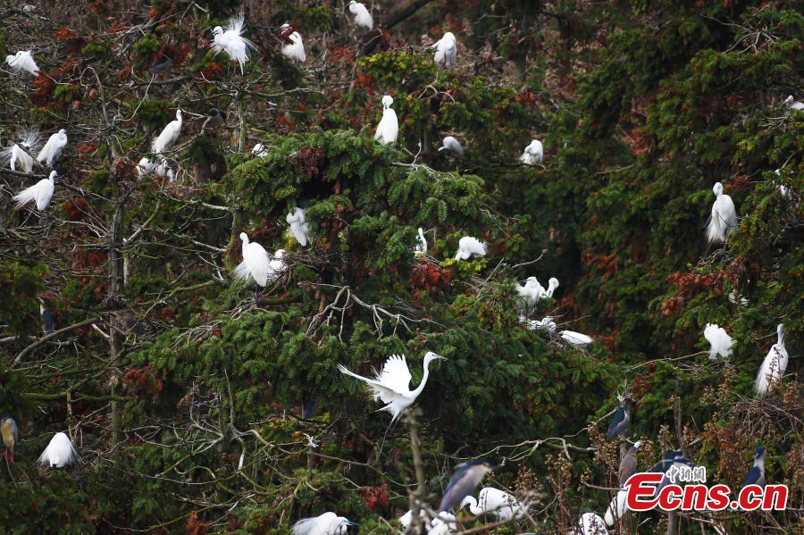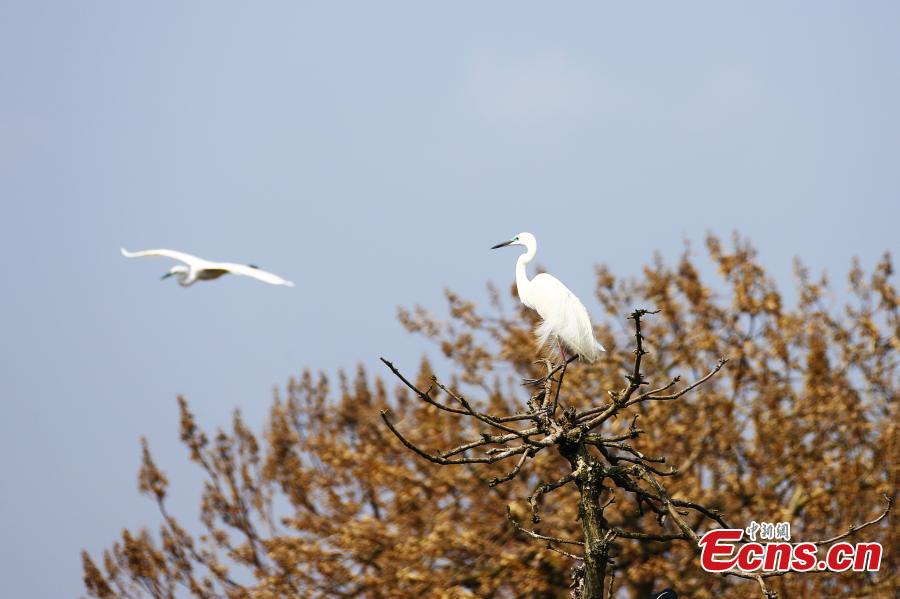 Egrets are seen in Xiangshan forest park in Xiangshan township of Nanchang, capital of East China's Jiangxi province, March 13, 2020. Egrets fly to the park for migration and reproduction from March to August every year. (Photo: China News Service/ Liu Zhankun)