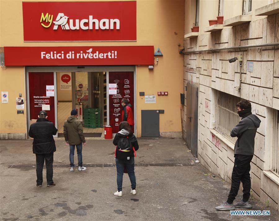 People wait to shop in front of a supermarket in Rome, Italy, March 14, 2020. (Xinhua/Liu Yongqiu)