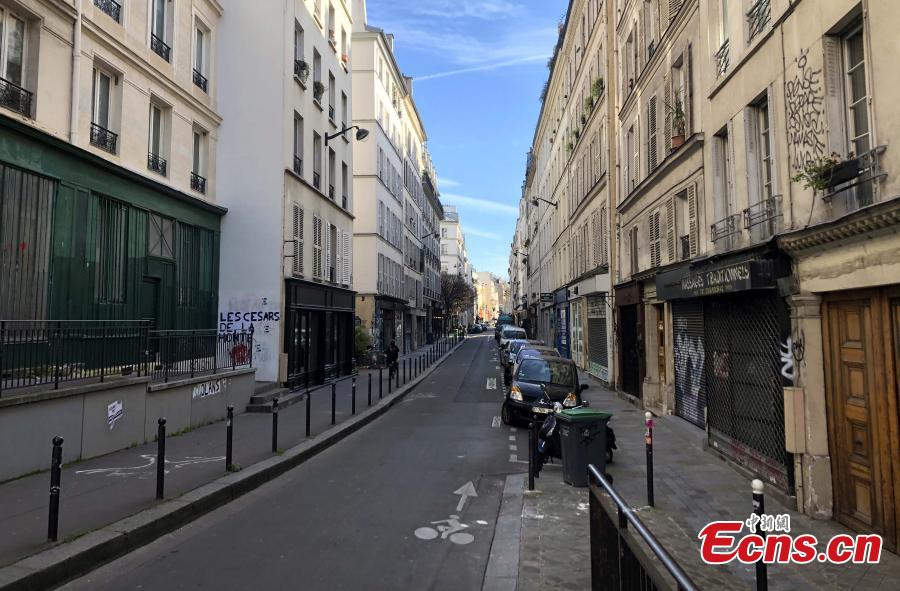 An empty street is seen in Paris, France, Mar. 15, 2020. Similar scenes of shuttered cafes, quiet streets and empty stores played out across the French capital after prime minister Edouard Philippe announced restrictions on French public life unprecedented in living memory. Restaurants, cafes, bars and cinemas are closed indefinitely from Sunday. So too will libraries, shopping malls, and sports halls?any venue deemed non-essential. Food stores and gas stations would remain open. (Photo: China News Service/ Li Yang)