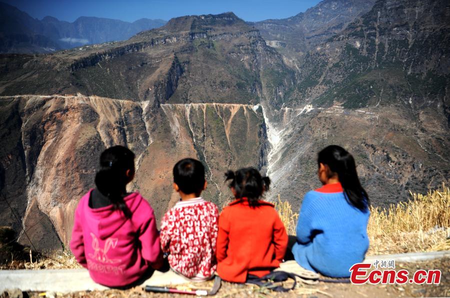 Children look at construction site of road linking Abuluoha village with Weimu village in Butuo county of Liangshan Yi autonomous prefecture, Southwest China's Sichuan province,Mar. 15, 2020. (Photo: China News Service/Liu Zhongjun)