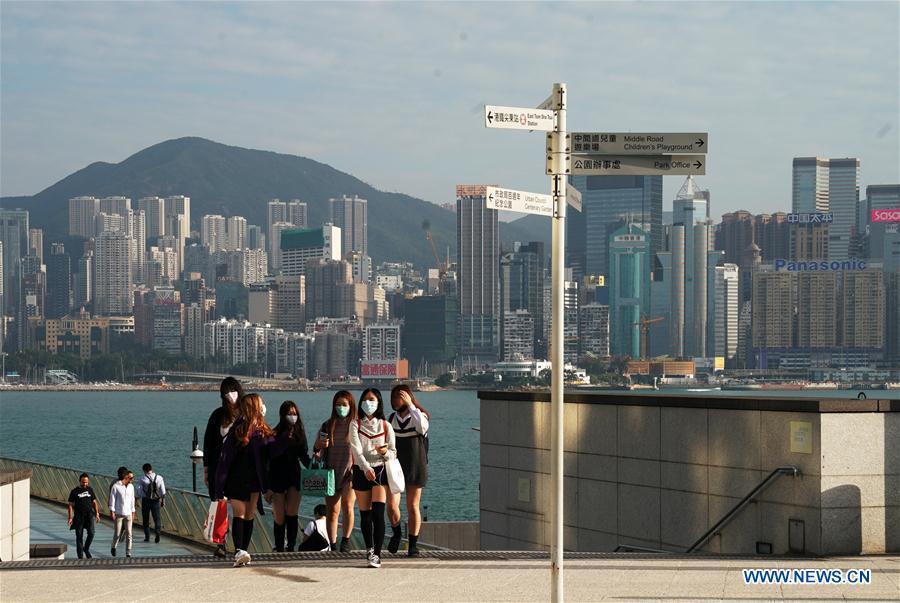 Pedestrians wearing face masks are seen at the Avenue of Stars in Tsim Sha Tsui of Hong Kong, south China, Feb. 23, 2020. Local authorities have undertaken a series of measures to protect their people from the threats of coronavirus. (Xinhua/Li Gang)