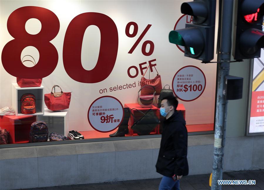 A man wearing a face mask walks by a shop window at the Central area in Hong Kong, south China, Feb. 22, 2020. Local authorities have undertaken a series of measures to protect their people from the threats of coronavirus. (Xinhua/Li Gang)