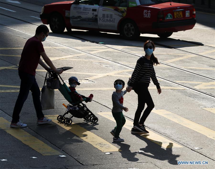 People cross a street at the Central area in Hong Kong, south China, Feb. 22, 2020. Local authorities have undertaken a series of measures to protect their people from the threats of coronavirus. (Xinhua/Li Gang)