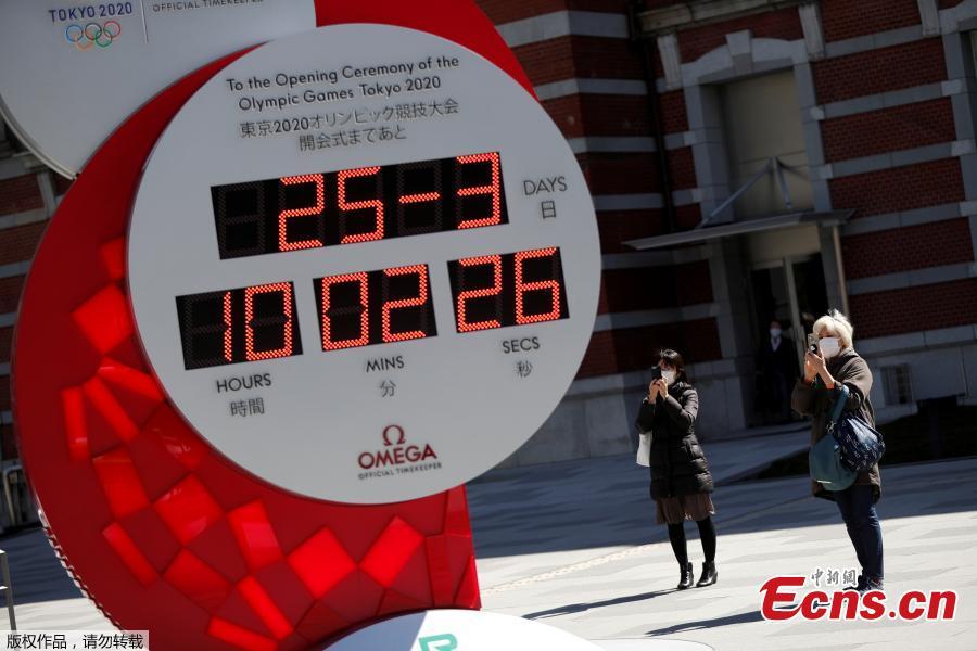 People wearing protective face masks due to the outbreak of coronavirus disease take pictures of an Omega clock, which was previously used as a countdown clock for the Tokyo 2020 Olympic Games and currently displaying current time and date, after the announcement of the games' postponement to the summer of 2021, in Tokyo, Japan, March 25, 2020. (Photo/Agencies)