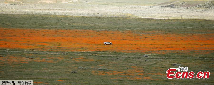 A vehicle is seen in a poppy field near the Antelope Valley California Poppy Reserve during the global outbreak of the coronavirus disease in Lancaster, California, U.S., March 25, 2020. (Photo/Agencies)
