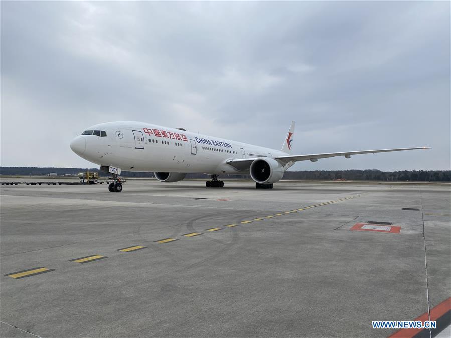 A plane carrying the third Chinese medical team arrives at Milan Malpensa Airport in Milan, Italy, March 25, 2020. A team of 14 medical experts from eastern China's Fujian Province arrived in Milan via a chartered flight to Italy on Wednesday to aid the European country's fight against the COVID-19 outbreak. (Str/Xinhua)
