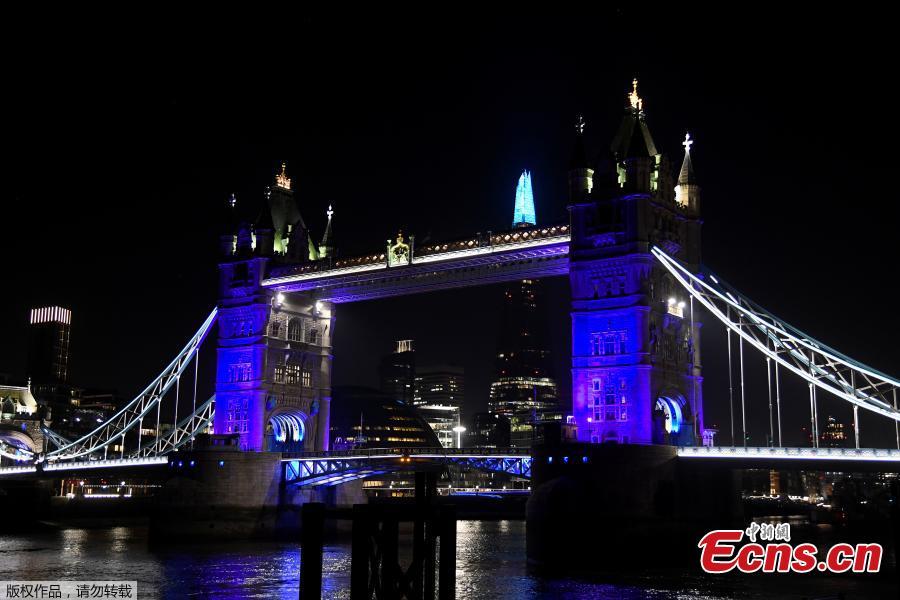 General view as Tower Bridge and the Shard are lit blue in support of the National Health Service (NHS), as the spread of the coronavirus disease (COVID-19) continues, London, Britain, March 26, 2020. (Photo/Agencies)