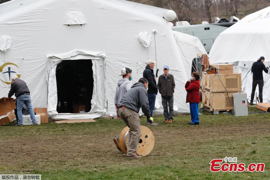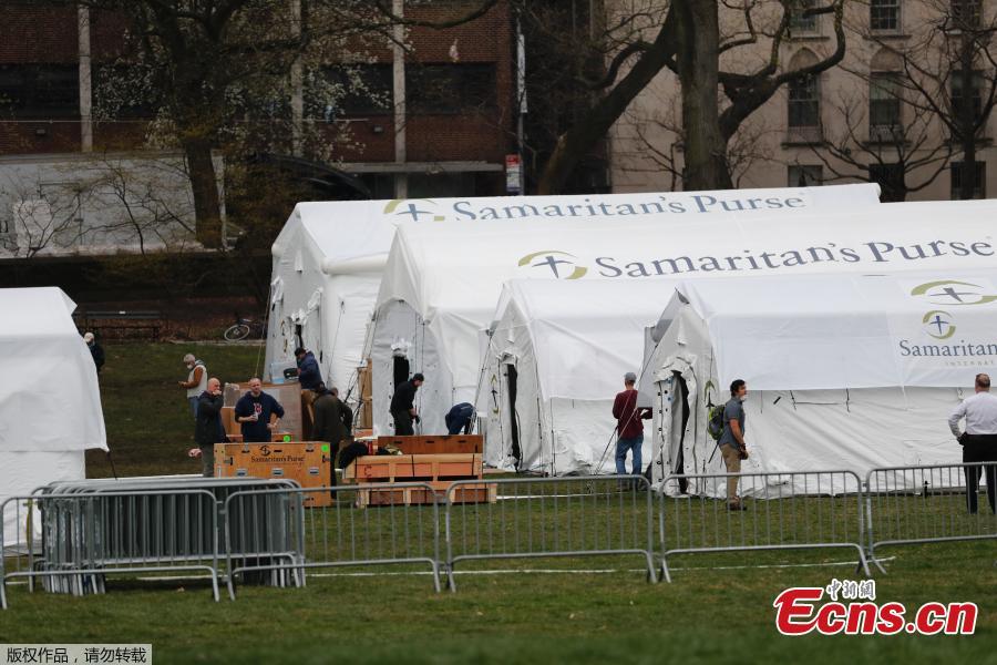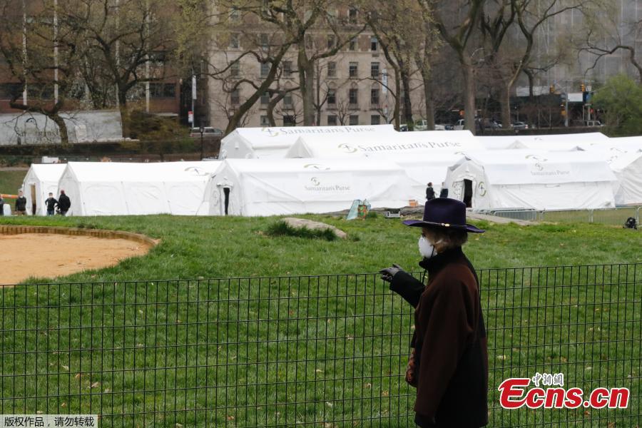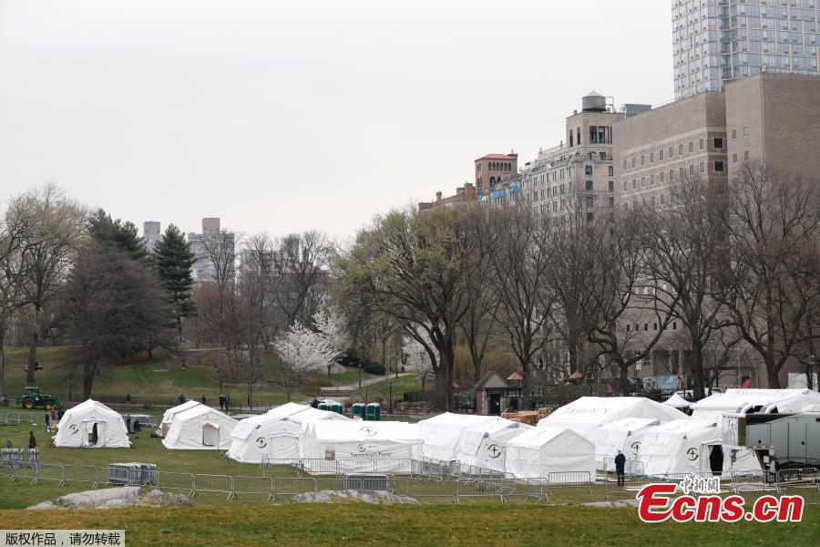 A temporary field hospital for the treatment of coronavirus patients is set up in New York's Central Park, March 30, 2020. (Photo: China News Service/Liao Pan)