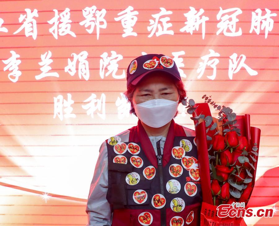 Epidemiologist Li Lanjuan (L3) is seen at a farewell ceremony held for her and her team before their leaving from Wuhan, Central China’s Hubei province, Mar. 21, 2020. (Photo: China News Service/Zhang Chang)