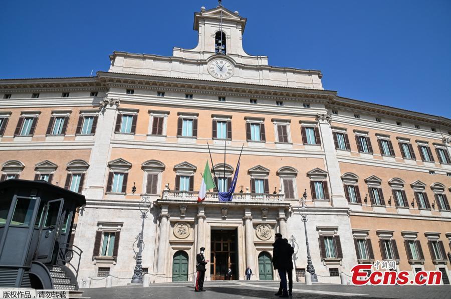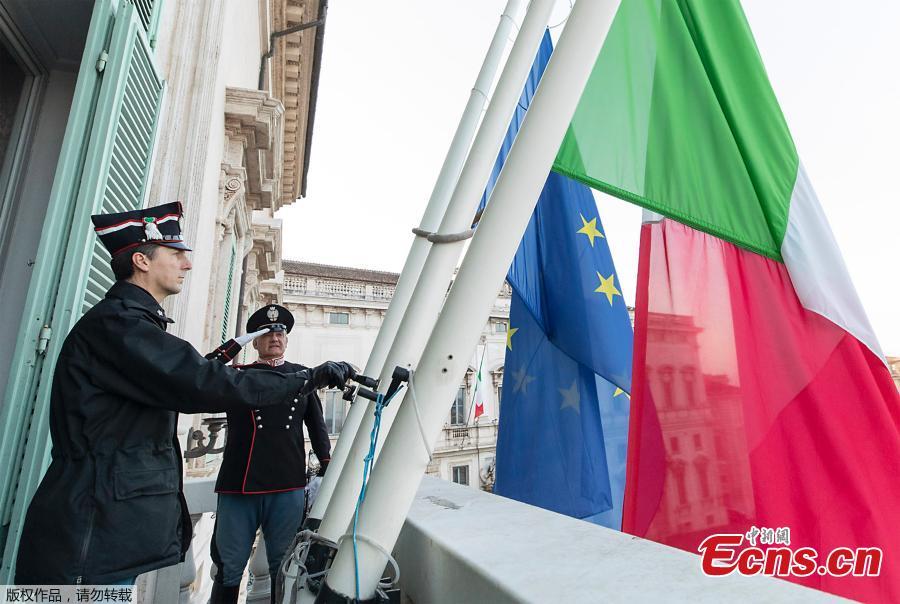 This photo taken on March 31, 2020 shows officers putting the flag of the European Union and the Italian flag at half-mast on the balcony above the main entrance to the Quirinale palace in Rome. Flags are to be flown at half-mast on March 31 in cities across Italy to commemorate the victims of the virus, during the country's lockdown aimed at curbing the spread of the coronavirus. (Photo/Agencies)