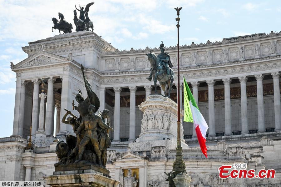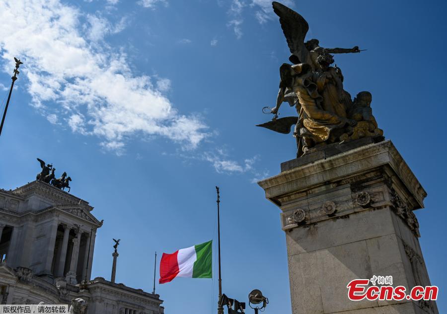 The Italian flag flies at half-mast on the Altare della Patria-Vittorio Emanuele II monument in Rome on March 31, 2020. Flags are to be flown at half-mast on March 31 in cities across Italy to commemorate the victims of the virus, during the country's lockdown aimed at curbing the spread of the coronavirus. (Photo/Agencies)