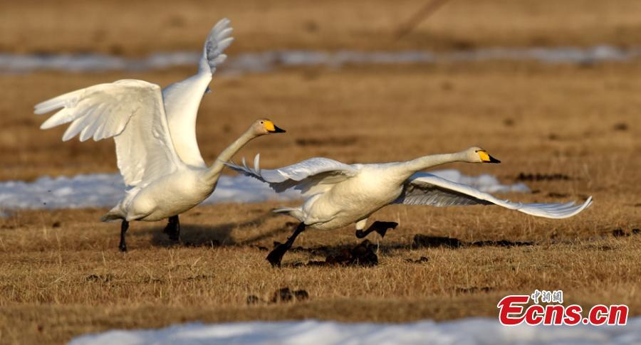 Large numbers of migratory birds, including swans, red ducks, spotted geese and grey cranes, have returned to the wetland in Bayinbuluk, northwest China’s Xinjiang Uyghur autonomous region. After the spring equinox, when the ice and snow began to melt, the wetland witnessed the peak season for migratory birds. The birds forage and frolic in the wetland, forming a beautiful picture on the plateau. (Photo: China News Service/ Que Hure)