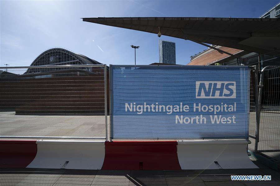 Photo taken on April 7, 2020 shows a general view of Manchester Central conference center which is being transformed into a field hospital to be known as the NHS Nightingale Hospital North West with a capacity to hold up to 750 beds for patients to help with the COVID-19 outbreak in Manchester, Britain. The death toll of those hospitalized in Britain who tested positive for COVID-19 reached 6,159 as of Monday afternoon, a daily increase of 786, the Department of Health and Social Care said Tuesday. (Photo by Jon Super/Xinhua)