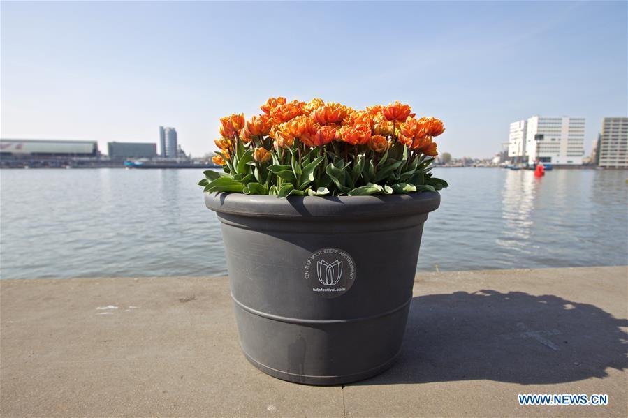 Tulips are seen at the central station in Amsterdam, the Netherlands, April 8, 2020. Amsterdam's Tulip Festival 2020 brings tulips into streets throughout the whole month of April. Due to the coronavirus epidemic, some tulip locations are closed this year. (Photo by Sylvia Lederer/Xinhua)