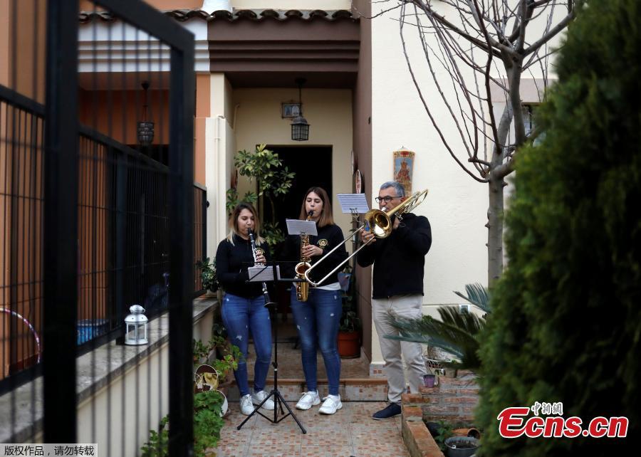 Eleuterio Moya, 54, and his daughters Paloma, 25, (C) and Marta, 22, members of the Arunda band music, play their instruments on the porch of their home as they celebrate the Holy Week, amid the coronavirus disease (COVID-19) outbreak, during the Holy Week in Ronda, southern Spain, April 9, 2020. (Photo/Agencies)