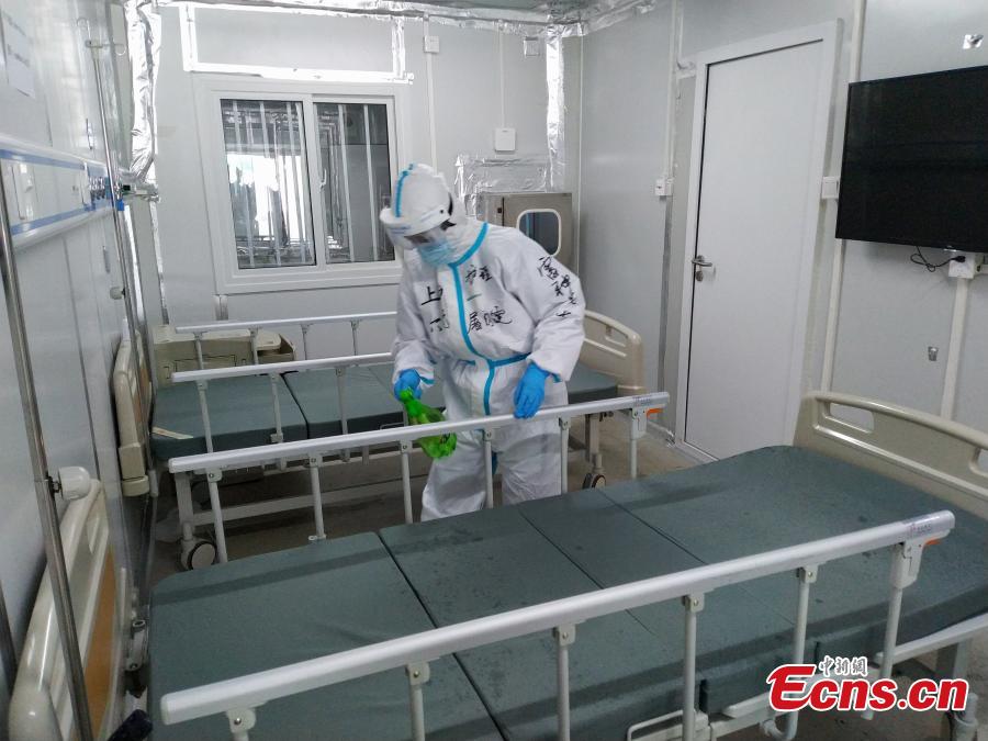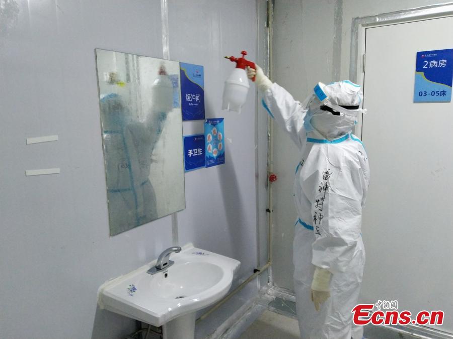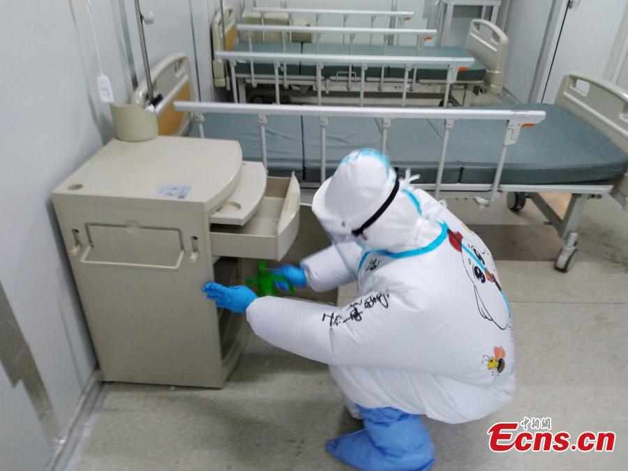 A medical worker disinfects a general ward area to be closed in Leishenshan (Thunder God Mountain) Hospital in Wuhan, central China's Hubei Province, April 9, 2020. The hospital shut down the last general ward area on Thursday. At present, a total of 15 COVID-19 patients are still treated in the Intensive Care Unit (ICU) wards of the hospital. (Photo: China News Service/ Ma Furong)