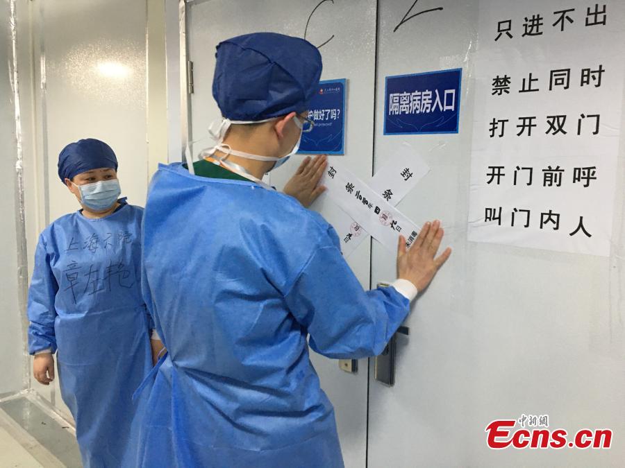 A medical worker pastes seals on the entrance to a general ward area in Leishenshan (Thunder God Mountain) Hospital in Wuhan, central China's Hubei Province, April 9, 2020. The hospital shut down the last general ward area on Thursday. At present, a total of 15 COVID-19 patients are still treated in the Intensive Care Unit (ICU) wards of the hospital. (Photo: China News Service/ Ma Furong)