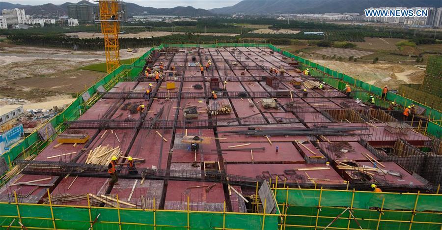 Aerial photo taken on April 9, 2020 shows the construction site of Yazhou Bay Science and Technology City in Sanya, south China's Hainan Province. The Yazhou Bay Science and Technology City, which has already kicked off infrastructure construction, signed with 51 enterprises and scientific research institutions in 2019. The science and technology city is expected to give technological momentum for the construction of the Hainan free trade port. (Xinhua/Yang Guanyu)