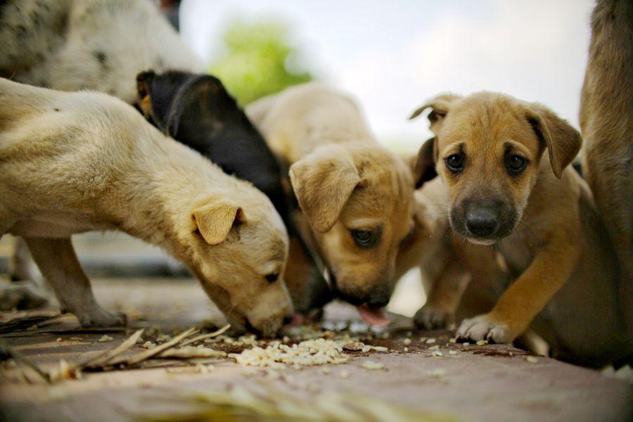 A member of an animal welfare organization distributes food to street dogs during the lockdown to contain the spread of COVID-19 in Kathmandu, Nepal, April 8, 2020. As the lockdown is imposed in Nepal to contain the spread of COVID-19, it's not just humans who are suffering but street dogs are too. An animal welfare organization Sneha's Care feeds and takes care of street dogs as these dogs, who were usually fed by neighbourhood stores, butcher shops and passers-by, are now facing difficulties to find food.(Photo by Sulav Shrestha/Xinhua)