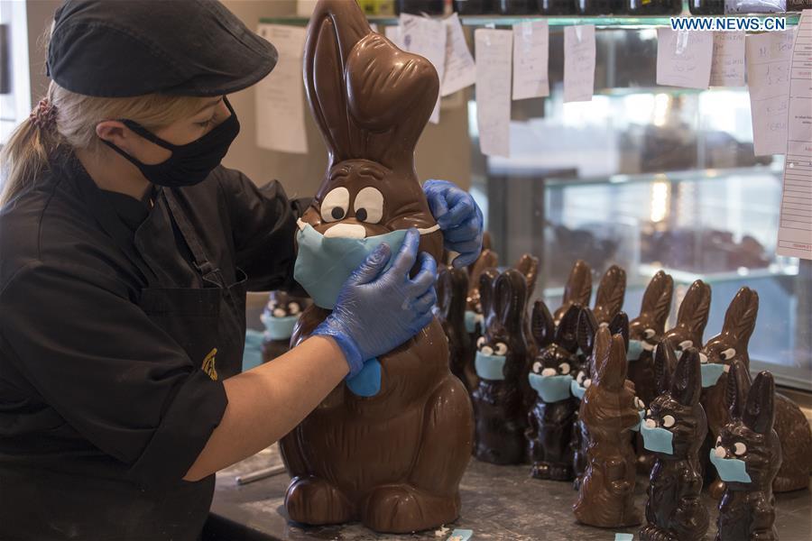 A pastry chef shows chocolate Easter bunnies wearing "masks" in Athens, Greece, on April 12, 2020. (Xinhua/Marios Lolos)