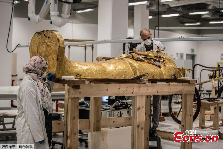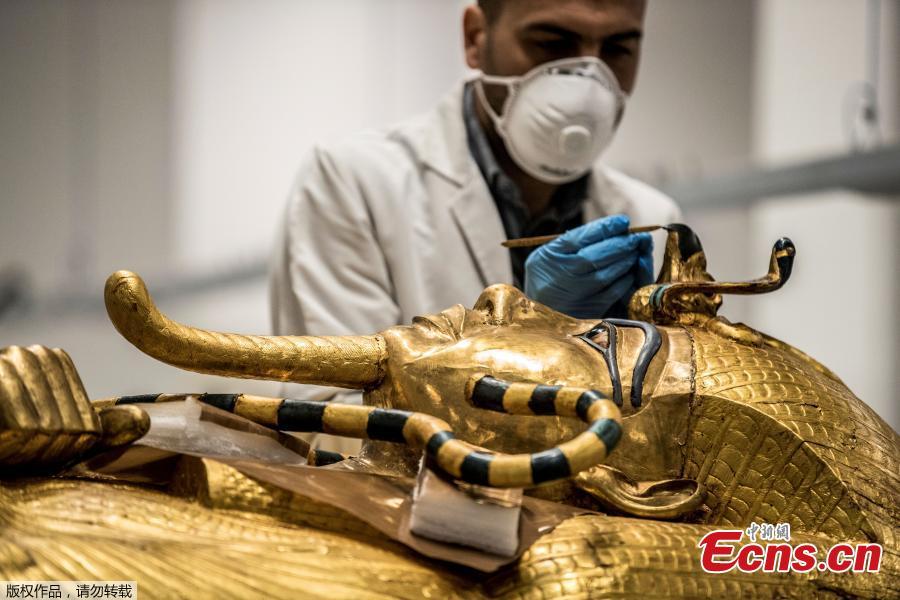 Egyptian archeologists, wearing personal protective equipment, performs restorations on the golden sarcophagus of the ancient Egyptian Pharaoh Tutankhamun (reigned between 1342-1325 BC) at the restoration lab of the newly-built Grand Egyptian Museum (GEM) in Giza on the southwestern outskirts of the capital Cairo on April 13, 2020. (Photo/Agencies)
