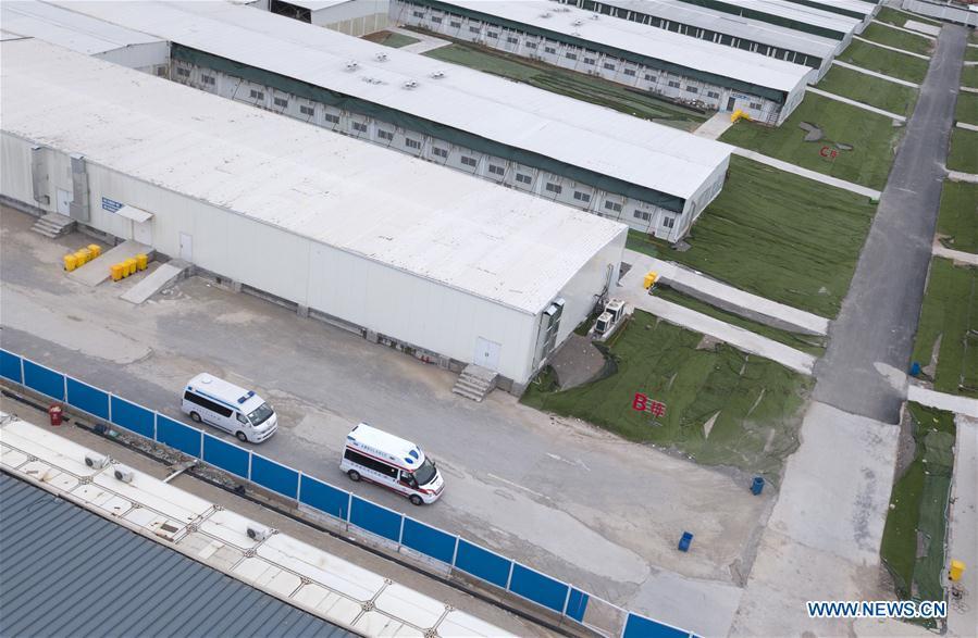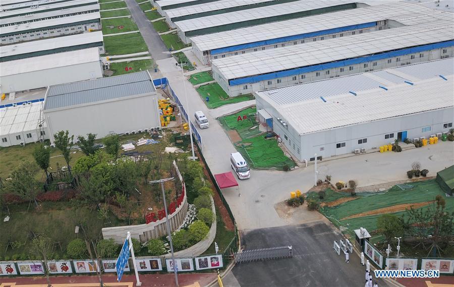 Aerial photo taken on April 14, 2020 shows ambulances transferring the last batch of COVID-19 patients to other hospitals at Leishenshan (Thunder God Mountain) Hospital in Wuhan, central China's Hubei Province. (Xinhua/Cheng Min)