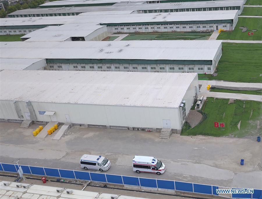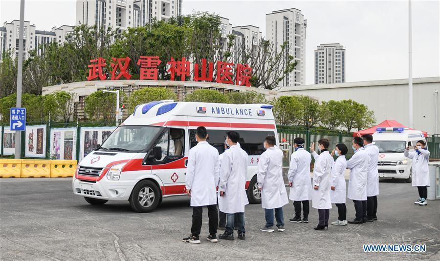 Ambulances, transferring the last batch of COVID-19 patients to other hospitals, leave Leishenshan (Thunder God Mountain) Hospital in Wuhan, central China's Hubei Province, April 14, 2020. (Xinhua/Cheng Min)